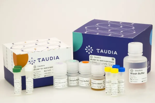 Taudia’s SPLASH Kit: Aβ40 & Aβ42 Duplex is designed to quantify amyloid-β 1-40 (Aβ40) and amyloid-β 1-42 (Aβ42) proteins in biofluids using a qPCR instrument. Each kit includes sufficient materials to run a total of 96 wells across two runs.