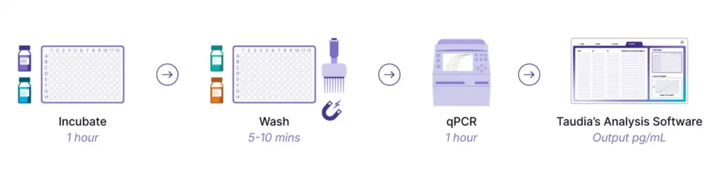 The benchtop workflow (Figure 2) provides a low barrier to entry with a straightforward protocol similar to traditional immunochemistry methods like ELISA. The only requirements are standard laboratory equipment and a qPCR instrument. Results are obtained in less than four hours, with less than 30 minutes of hands-on-time. This straightforward workflow is particularly suited for laboratories seeking to implement ultrasensitive protein detection without significant infrastructure investment.